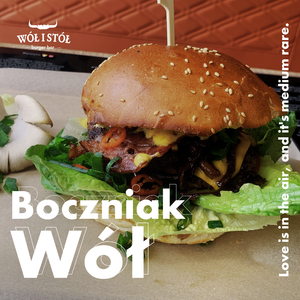 wól, grillowany bekon, boczniaki w sosie sojowym z chilli, szczypiorek, salata rzymska, pikle, cheddar, sos bialy, sos sezamowy